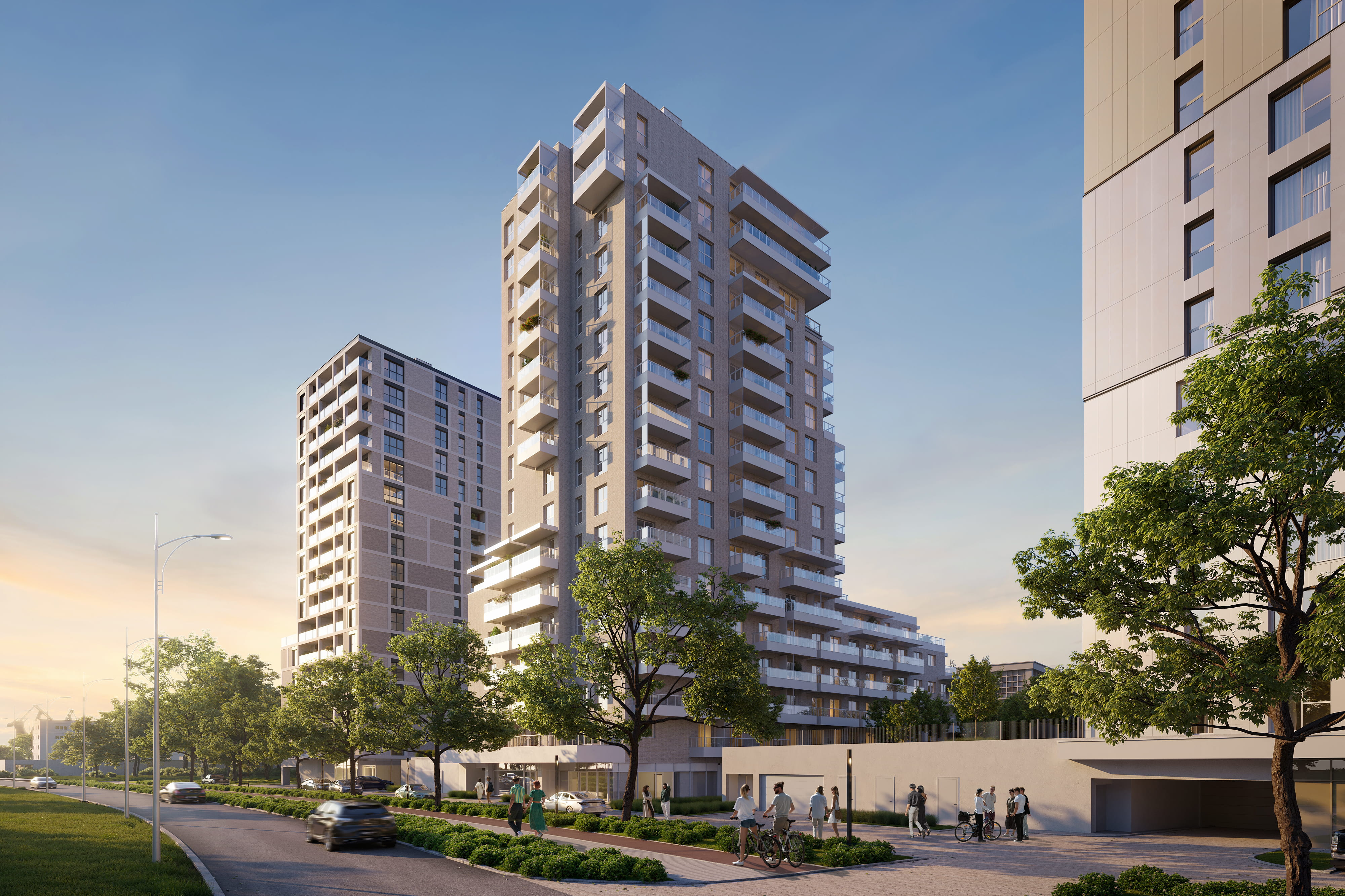 Projekt pierwszego 15-piętrowego apartamentowca realizowanego w ramach inwestycji WENDY wyróżnia się oryginalnym efektem kaskadowej fasady wykonanej z wysokiej jakości materiałów, które lśnić będą w słońcu. Elewacja w stonowanych, eleganckich barwach bieli, grafitu i złotych odcieni, w połączeniu z efektownymi przeszkleniami nada bryle lekkości – otwierając budynek na piękno okolicznego krajobrazu i zapewniając mieszkańcom imponujący widok na port, zatokę lub pobliską naturę.