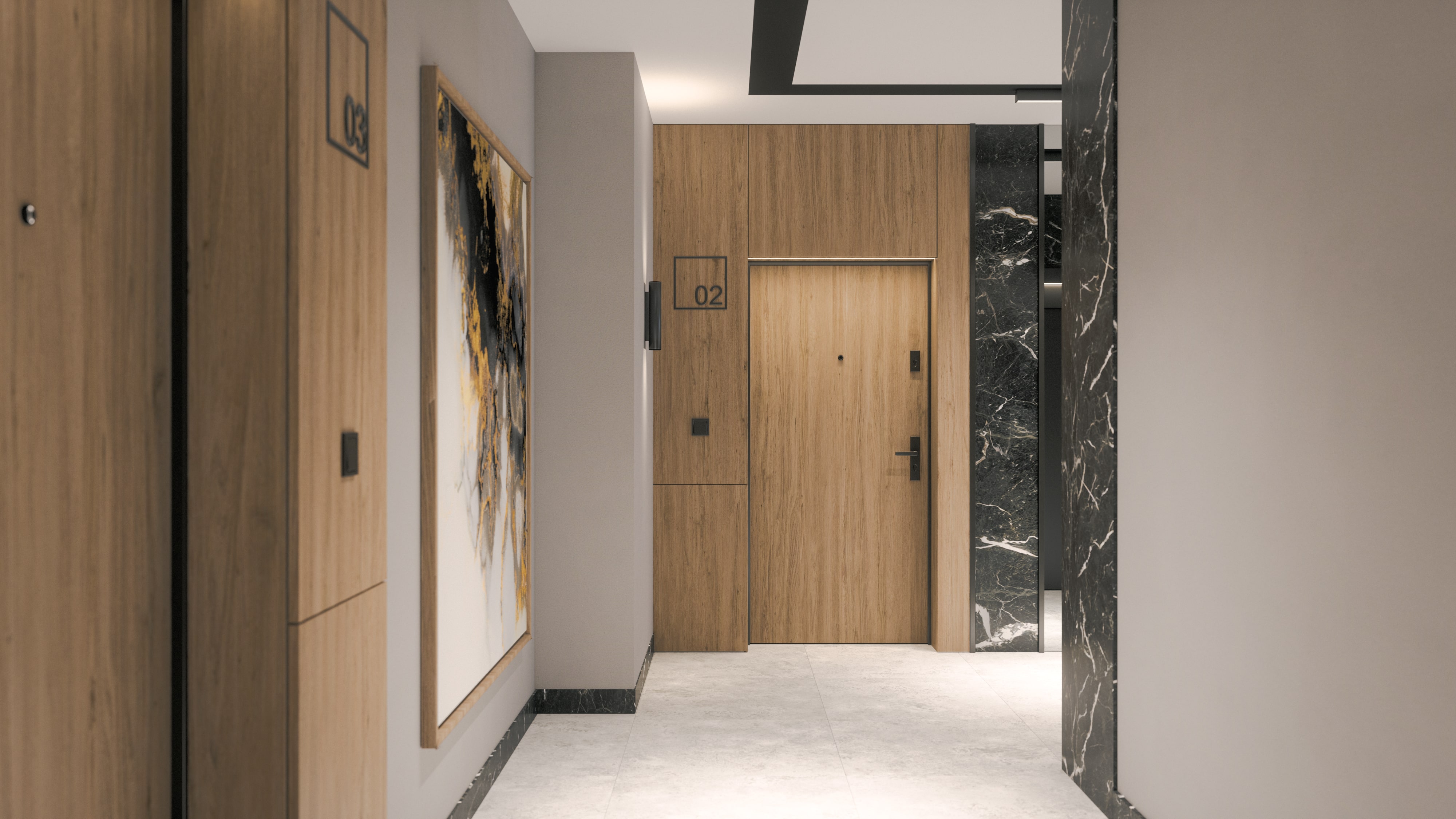 Części wspólne w naszych budynkach są eleganckie i mają indywidualnie zaprojektowany wystrój wzbogacony przez lustra, tapety, fototapety, panele oraz stylowe oświetlenie.