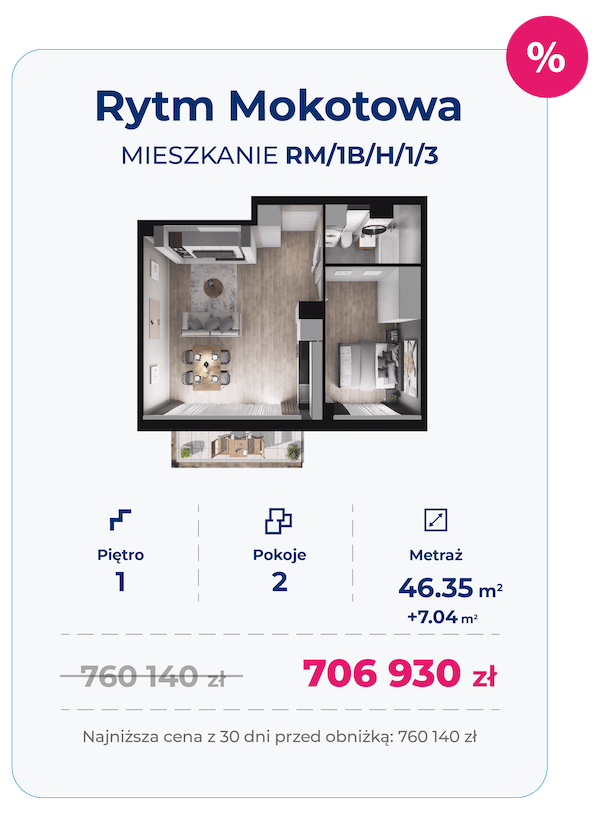 Zamieszkaj w inwestycji Rytm Mokotowa i skorzystaj z nowych, jeszcze lepszych cen! Przekonaj się, jak tanio możesz teraz kupić swoje wymarzone mieszkanie na Dolnym Mokotowie. Teren, na którym powstaje ten wyjątkowy projekt to dynamicznie rozwijająca się okolica, która właśnie zyskuje nowe oblicze i już wkrótce stanie się jednym z najmodniejszych adresów w mieście. Kupując mieszkanie teraz zapłacisz jedynie 20% jego wartości, a resztę dopiero przed odbiorem kluczy.
